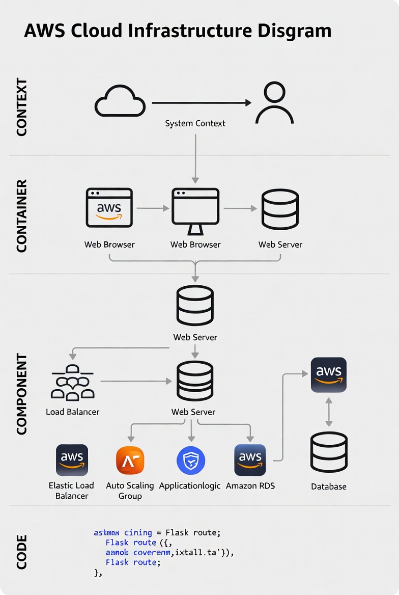 The C3 (Component) level often aligns directly with AWS component diagrams. At this level, we focus on individual components within a container—like a specific microservice, a database module, or a message queue—and show their interactions. AWS diagrams can visually represent these components using icons for RDS, S3, SQS, or Lambda, allowing technical teams to bridge the gap between abstract architecture and concrete cloud resources.